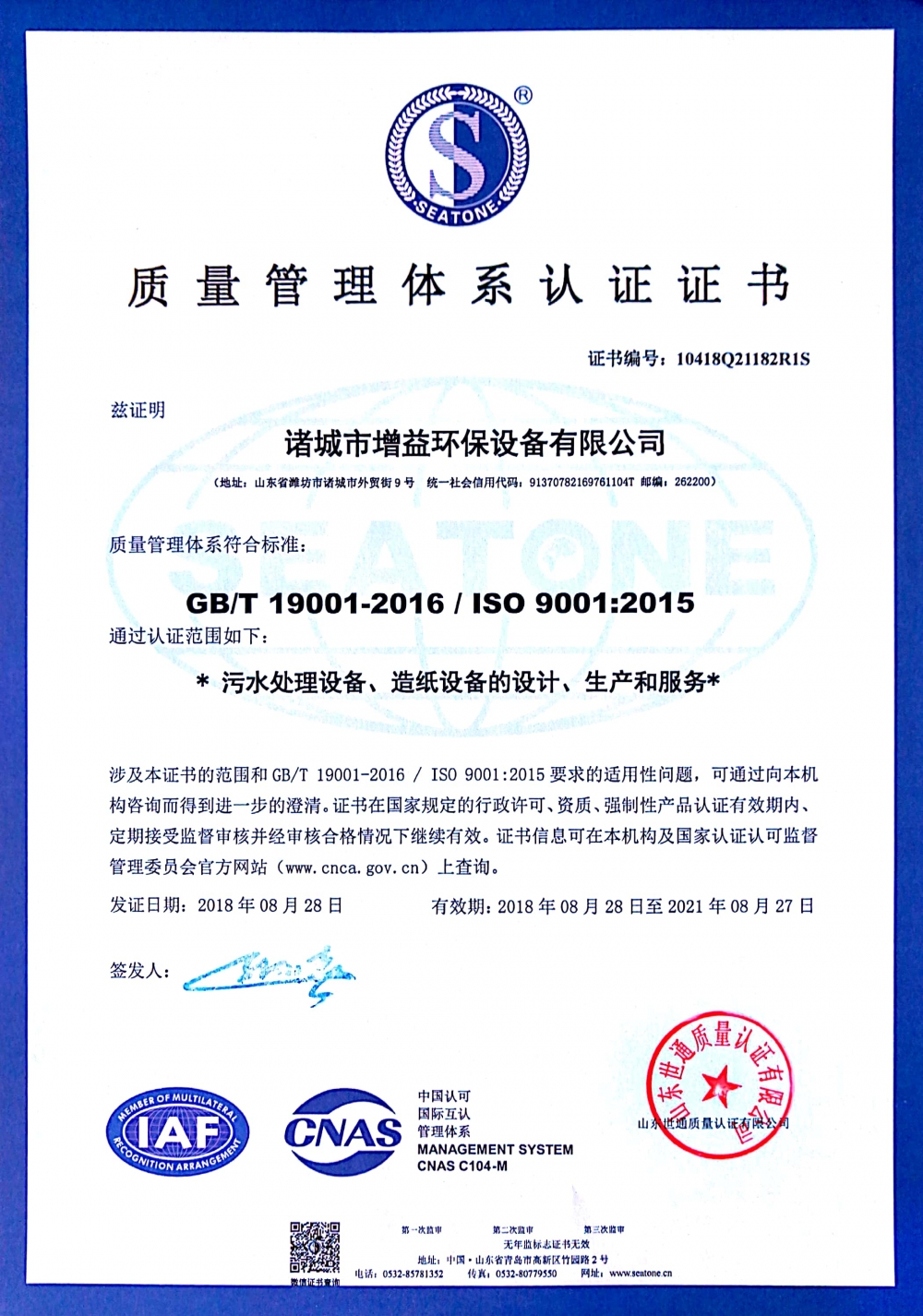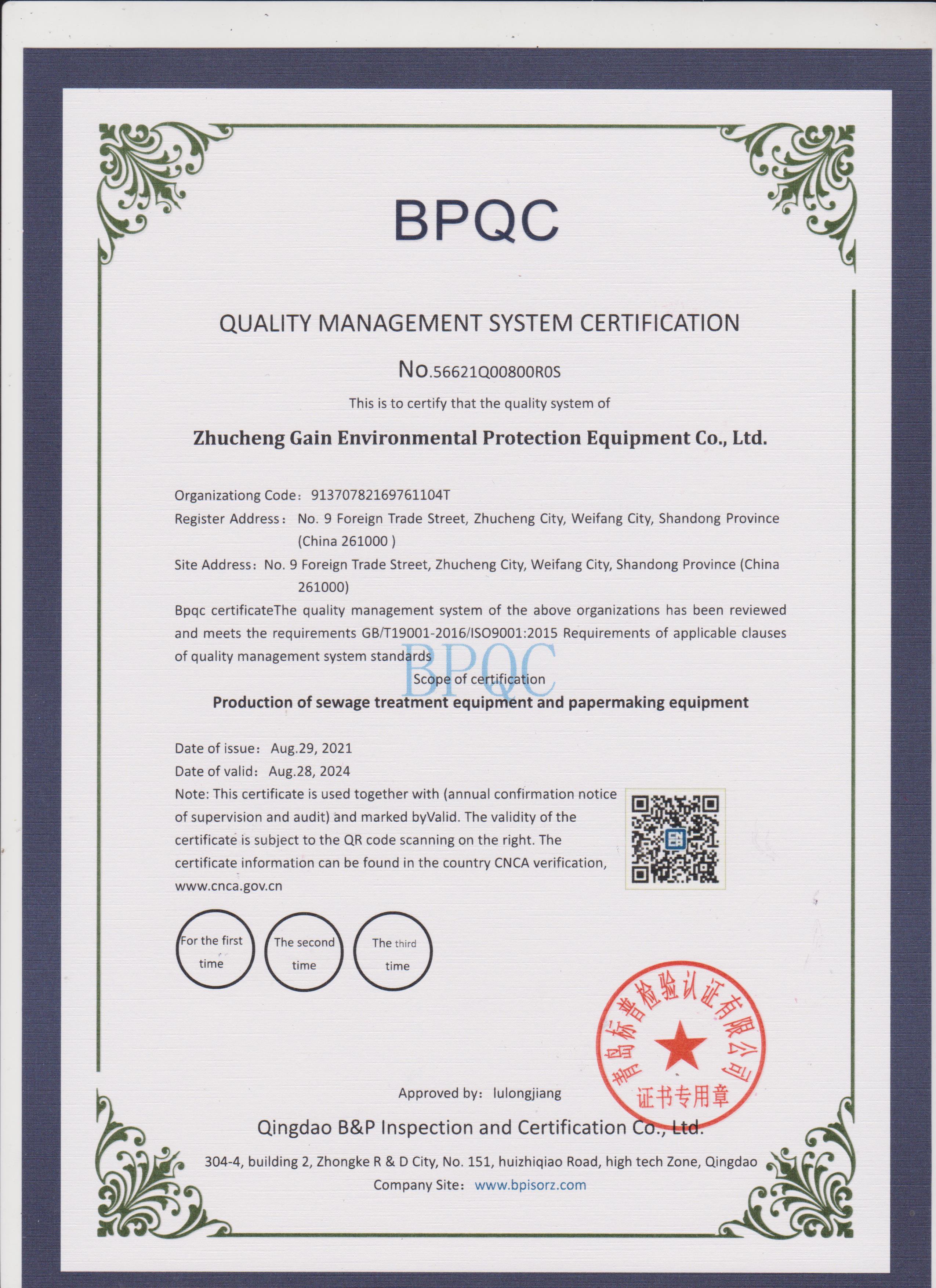 專家組通過查閱記錄、現(xiàn)場檢查、詢問等評審手段,對我公司進(jìn)行了嚴(yán)格的審核。審核工作覆蓋了質(zhì)量管理工作所涉及的所有部門和環(huán)節(jié),對每一個(gè)細(xì)節(jié)都進(jìn)行了嚴(yán)謹(jǐn)?shù)暮瞬椤?/p> 公司領(lǐng)導(dǎo)高度重視此項(xiàng)工作,提出了“切合實(shí)際、勇于創(chuàng)新、務(wù)求實(shí)效”的整體思路,積極開展全體動(dòng)員、全員培訓(xùn)、體系文件的建立和運(yùn)行、內(nèi)部審核和管理評審等一系列工作。 經(jīng)過兩天工作會(huì)議細(xì)致認(rèn)真的審核,專家小組認(rèn)為,我公司已按ISO9001的要求進(jìn)行了質(zhì)量管理體系建立工作,符合認(rèn)證標(biāo)準(zhǔn),我公司的質(zhì)量管理體系達(dá)到其規(guī)定的質(zhì)量方針、質(zhì)量目標(biāo)并具有持續(xù)改進(jìn)的能力。 正是在增益環(huán)保各個(gè)部門及全體員工的共同努力下,才得以順利通過質(zhì)量管理體系認(rèn)證,我司在認(rèn)證過程中不斷完善了組織內(nèi)部管理,使質(zhì)量管理制度化、體系化和法制化,提高產(chǎn)品質(zhì)量,并確保產(chǎn)品質(zhì)量的穩(wěn)定性。為推進(jìn)公司管理的規(guī)范化,實(shí)現(xiàn)管理工作的制度化、標(biāo)準(zhǔn)化,公司早在2008年,2015年就開展ISO9001質(zhì)量管理認(rèn)證工作并順利通過了中質(zhì)協(xié)質(zhì)保中心的認(rèn)證審核。 如今又順利通過了中質(zhì)協(xié)質(zhì)保中心的認(rèn)證審核。 增益環(huán)保一貫堅(jiān)持以客戶有效需求為中心,貼近客戶,認(rèn)真聆聽客戶聲音,全力滿足客戶有效需求,對管理和產(chǎn)品的嚴(yán)格把控更是表明尊重客戶權(quán)益和對社會(huì)負(fù)責(zé),使客戶可以更放心采購增益環(huán)保的產(chǎn)品。 此次通過ISO9001質(zhì)量管理體系認(rèn)證,是對我司實(shí)力、商業(yè)信譽(yù)、管理水平等的高度認(rèn)可,說明增益環(huán)保在各項(xiàng)管理系統(tǒng)整合上已達(dá)到了國際標(biāo)準(zhǔn),我司全體員工將再接再厲,嚴(yán)格按照質(zhì)量管理體系的要求執(zhí)行,使我司的質(zhì)量管理體系持續(xù)改進(jìn),不斷提高,務(wù)求為客戶提供更優(yōu)質(zhì)服務(wù)及產(chǎn)品!